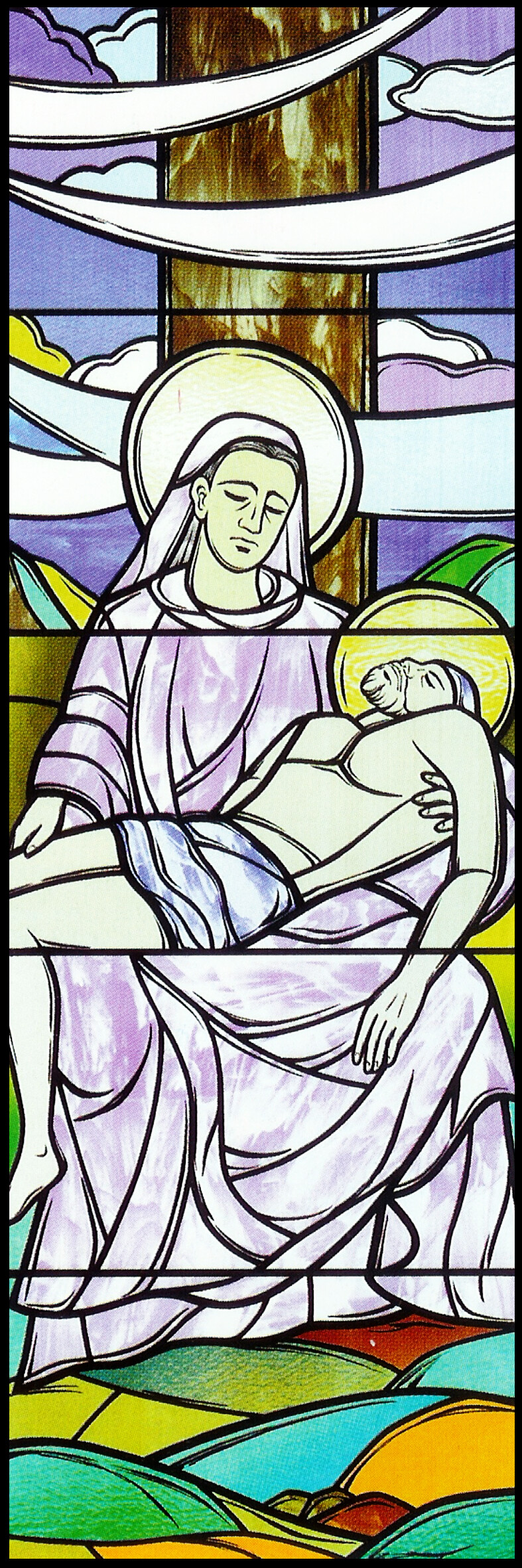5매가 1세트인 대형성화 그라스벨입니다. 모양과 크기가 다양한 건축물의 창문에 대형성화 패턴은 효과적일 것입니다. 대형성화는 기본형의 2매, 3매, 4매, 5매, 10매가 각각 세트로 구성되어 있으며 주로 인물성화를 다루어 다양한 시각적, 심미적인 효과를 주어 어린아이부터 노인까지 그리스도의 메시지를 전달 받을 수 있도록 고안된 제품입니다. 설명이 충분히 들어간 디자인이므로 주로 중심에 대형성화를 배치하여 주제로 사용하고 주변은 모자이크 패턴을 사방으로 연결하여 시공합니다. (하단의 디테일 이미지는 해상도가 낮아 보이지만, 실 제품은 선명하고 컬러감이 뚜렷하게 인쇄된 제품입니다.)