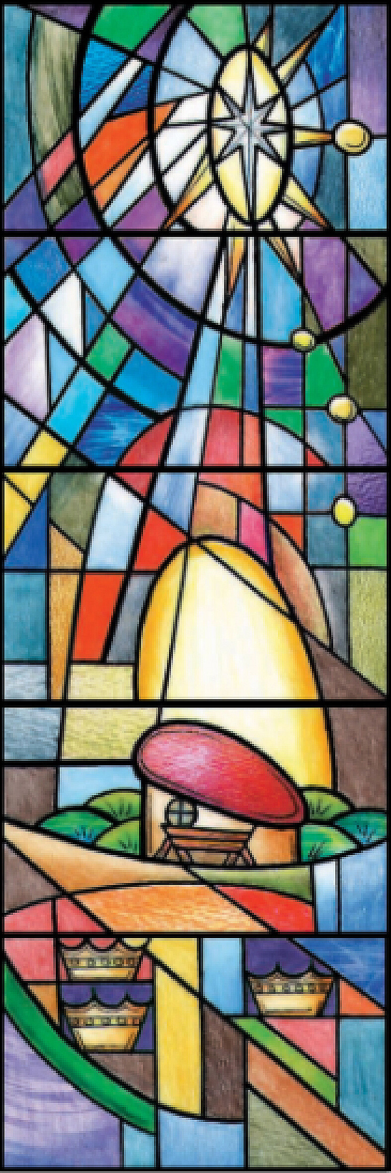5매가 1세트인 대형성화 그라스벨입니다. 모양과 크기가 다양한 건축물의 창문에 대형성화 패턴은 효과적일 것입니다. 대형성화는 기본형의 2매, 3매, 4매, 5매, 10매가 각각 세트로 구성되어 있으며 주로 인물성화를 다루어 다양한 시각적, 심미적인 효과를 주어 어린아이부터 노인까지 그리스도의 메시지를 전달 받을 수 있도록 고안된 제품입니다. 설명이 충분히 들어간 디자인이므로 주로 중심에 대형성화를 배치하여 주제로 사용하고 주변은 모자이크 패턴을 사방으로 연결하여 시공합니다. (하단의 디테일 이미지는 해상도가 낮아 보이지만, 실 제품은 선명하고 컬러감이 뚜렷하게 인쇄된 제품입니다.)