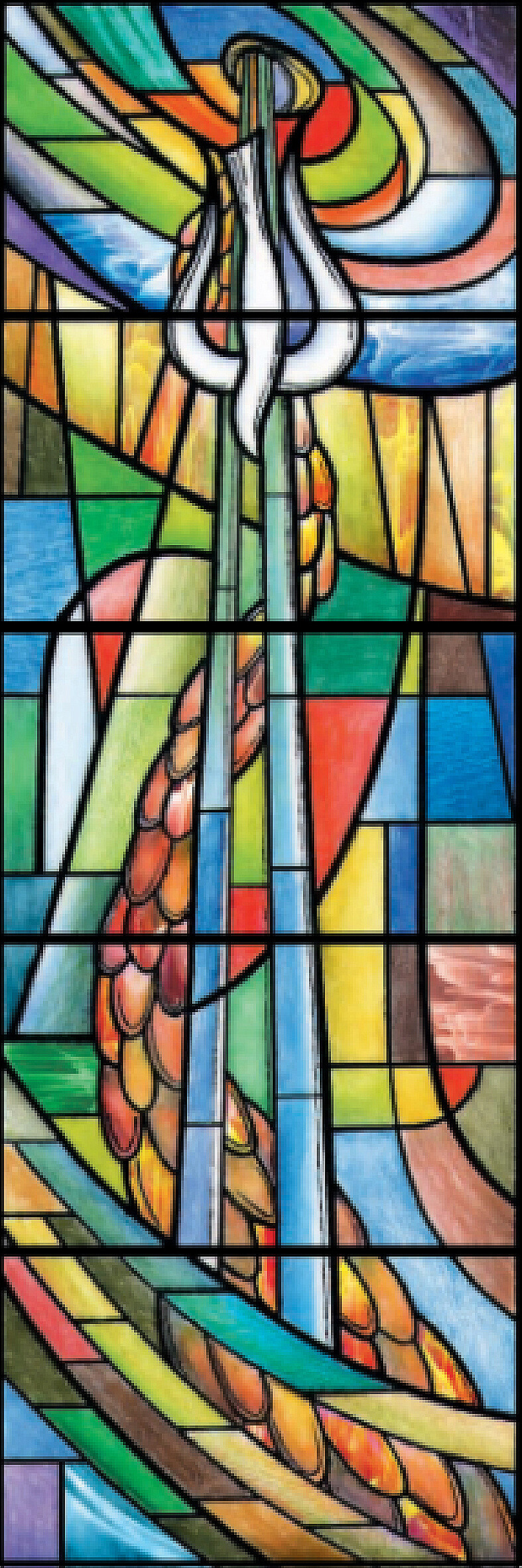 5매가 1세트인 대형성화 그라스벨입니다. 모양과 크기가 다양한 건축물의 창문에 대형성화 패턴은 효과적일 것입니다. 대형성화는 기본형의 2매, 3매, 4매, 5매, 10매가 각각 세트로 구성되어 있으며 주로 인물성화를 다루어 다양한 시각적, 심미적인 효과를 주어 어린아이부터 노인까지 그리스도의 메시지를 전달 받을 수 있도록 고안된 제품입니다. 설명이 충분히 들어간 디자인이므로 주로 중심에 대형성화를 배치하여 주제로 사용하고 주변은 모자이크 패턴을 사방으로 연결하여 시공합니다. (하단의 디테일 이미지는 해상도가 낮아 보이지만, 실 제품은 선명하고 컬러감이 뚜렷하게 인쇄된 제품입니다.)