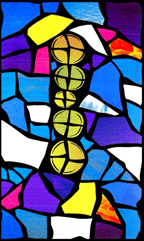 슬랩성화 패턴의 그라스벨입니다. 슬랩성화는 슬랩 글라스의 느낌과 유사하게 표현되도록 제작한 제품이며, 슬랩 글라스는 유리의 두께가 25mm ~ 60mm가 되는 색유리를 사용하여 빛의 굴절과 투시성이 깊어서 실내를 엄숙하면서도 성스럽게 해주는 고급스러운 유리입니다. 이러한 슬랩 글라스의 효과를 최대한 표현하고자 선은 굵게, 색은 짙게 사용하였고 주제도 단순화하여 더욱 경건하고 성스러운 공간미를 창출할 수 있도록 제작된 제품입니다.