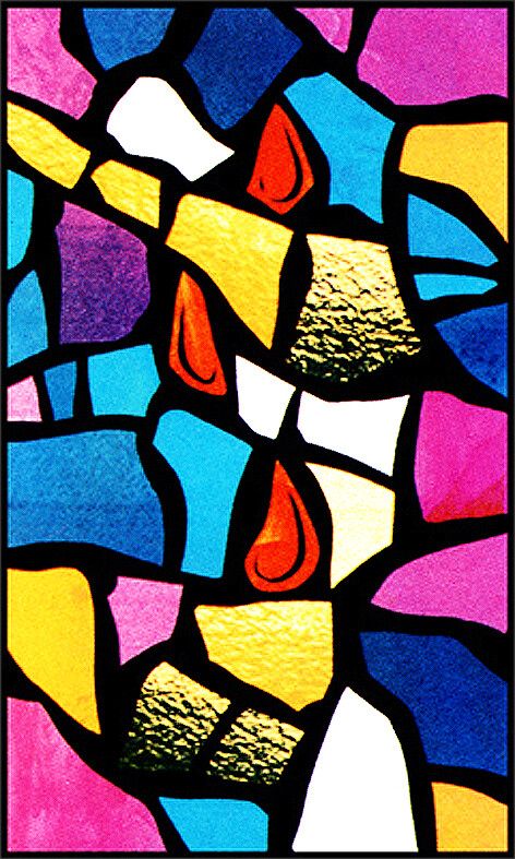 슬랩성화 패턴의 그라스벨입니다. 슬랩성화는 슬랩 글라스의 느낌과 유사하게 표현되도록 제작한 제품이며, 슬랩 글라스는 유리의 두께가 25mm ~ 60mm가 되는 색유리를 사용하여 빛의 굴절과 투시성이 깊어서 실내를 엄숙하면서도 성스럽게 해주는 고급스러운 유리입니다. 이러한 슬랩 글라스의 효과를 최대한 표현하고자 선은 굵게, 색은 짙게 사용하였고 주제도 단순화하여 더욱 경건하고 성스러운 공간미를 창출할 수 있도록 제작된 제품입니다.