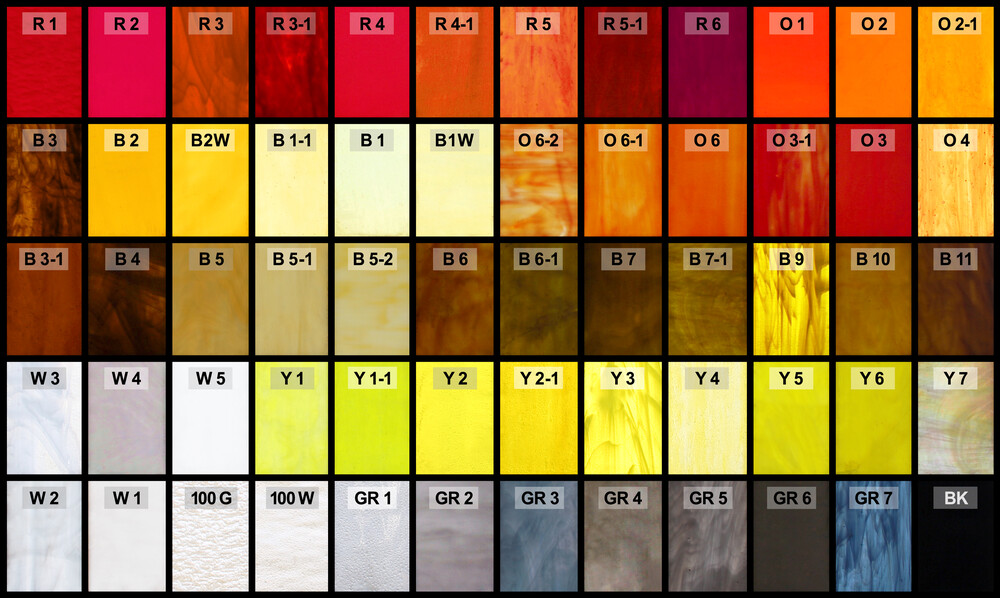 그라시아깃들에서는 프랑스 생고뱅(Saint Just)을 비롯한 독일의 램버트(Lamberts), 미국의 스펙트럼(Spectrum), 중국의 색유리까지 직수입하여 낱장으로 판매하고 있습니다. 다양한 종류의 품질과 200여 가지 색상을 취급하므로 조건에 맞는 유리를 택하여 원하시는 작품을 만들 수 있습니다. 색유리는 입으로 불어서 만드는 최상급의 마우스 브로운(Mouth Blown)과 기계로 찍어서 만드는 머신 드로운(Machine Drawn)이 있으며, 투명 유리와 반투명, 불투명 유리까지 다양하게 보유하고 있습니다. 색유리는 제조과정에서 규석, 금, 장석, 아비산 카드뮴, 산화크롬 등 여러 가지 금속 물질이 고온에서 화학 결합되어 각기 다른 색으로 만들어집니다. 이것은 모두 1400℃ 이상의 고온에서 색이 생성되므로 색상이 퇴색되거나 변색되는 일이 없이 영구적입니다.